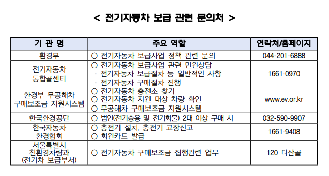 전기차 보조금 지원과 관련된 자세한 사항은 환경부 전기차 통합콜센터(☎1661-0970) 또는 서울시 다산콜센터(☎120)로 문의하시기 바랍니다.