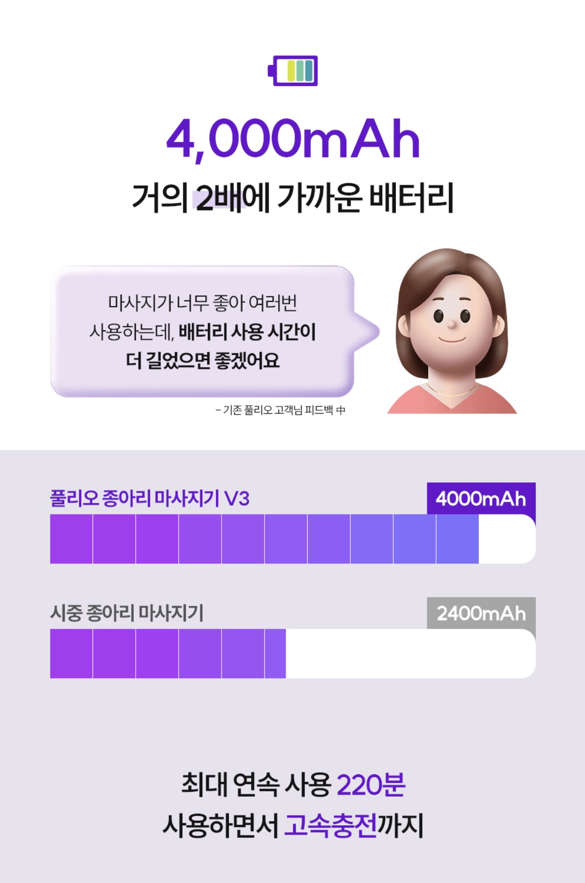 이 풀리오 제품은 지퍼와 벨크로의 이중형 디자인 덕분에 풀리오 제품을 누구나 쉽게 사용할 수 있어요. 또한, 이 풀리오 제품은 3단계 온열 기능과 마사지 강도 조절을 통해 각자에게 맞는 마사지를 받을 수 있답니다. 💆♀️