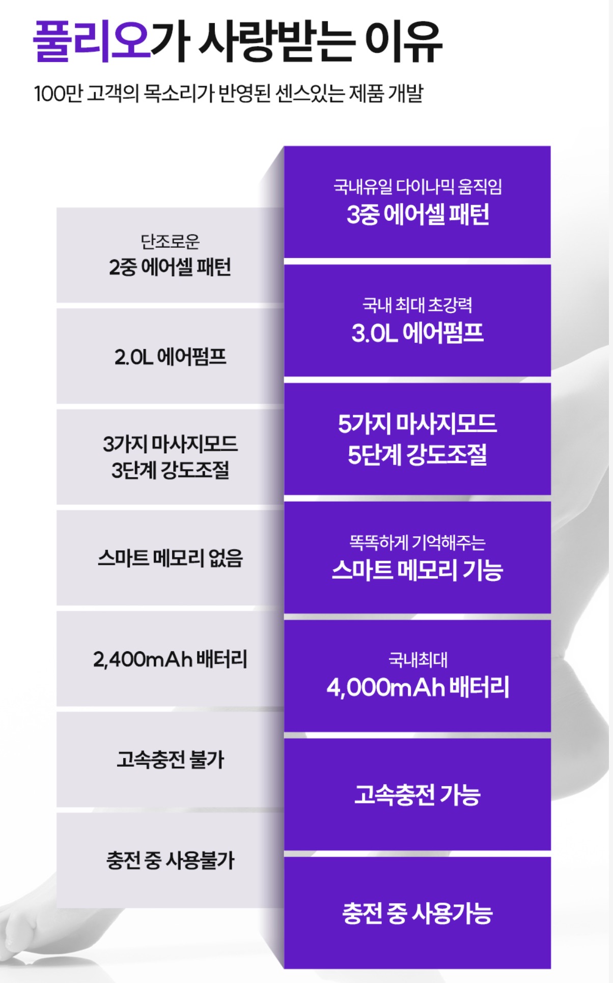 풀리오 종아리 마사지기는 2.6L 에어펌프를 탑재해 강력한 마사지를 제공합니다. 풀리오는 다른 제품들과 비교했을 때, 풀리오는 실제 용량을 정확히 기재하고 과장 광고가 없어요. 풀리오는 진실성도 큰 장점이에요! 💪